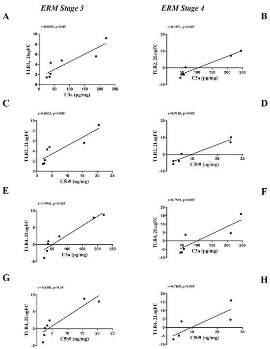 Correlation analysis for TLRs (transcripts) and complement fragments (vitreal levels) depending on ERM severity. Scatterplot specific for TLR2/C3a at stage 3 (A) and stage 4 (B); TLR2/C5b9 at stage 3 (C) and stage 4 (D); for TLR4/C3a at stage 3 (E) and stage 4 (F); for TLR4/C5b9 at stage 3 (G) and stage 4 (H). Note the positive correlation between complement fragments and TLR2 and TLR4. The result of Pearson correlation analysis is shown inside each panel (correlation coefficient, r, and significance).