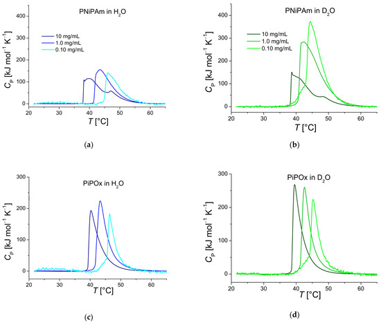 - Kunugi, S.; Tada, T.; Tanaka, N.; Yamamoto, K.; Akashi, M. Microcalorimetric Study of Aqueous Solution of a Thermoresponsive Polymer, Poly(N-Vinylisobutyramide) (PNVIBA). Polym. J. 2002, 34, 383–388. [Google Scholar] [CrossRef][Green Version]