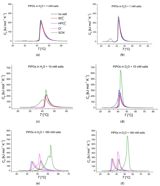 - Moghaddam, S.Z.; Thormann, E. Hofmeister Effect on Thermo-Responsive Poly(Propylene Oxide) in H2O and D2O. RSC Adv. 2016, 6, 27969–27973. [Google Scholar] [CrossRef]