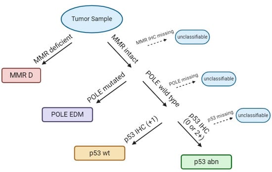 In this perspective, Talhouk et al. [34] developed a more pragmatic testing method for molecular assessment of EC, known as Proactive Molecular Risk Classifier for Endometrial Cancer (ProMisE), intending to create a clinically applicable molecular-based classification system for EC [35], based on MMR protein search (MLH1, MSH2, MSH6, PMS2) by immunohistochemistry, POLE mutational analysis, and p53 immunohistochemistry as a surrogate for ‘copy-number’ status instead of genomic methodology [34]. Later, a second cohort validated the results found in the previous paper [36]. Final ProMisE (Figure 1) results showed that POLE had a better prognosis, and p53 mutants had the worst [11].