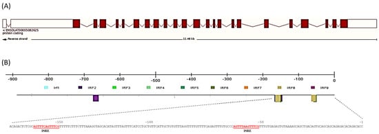 Interferon promoter binding sites are found in the European sea bass herc7 gene promoter. (A) Exon–intron organization of herc7 gene; (B) herc7 promoter transcription binding factors. IRF, interferon regulatory factors; ISRE, interferon-sensitive regulatory elements.