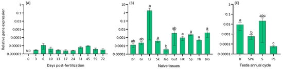 For ontogenetic study purposes, 3 pools of eggs (500 mg each) at 0 days post-fertilization (dpf) and 3 pools of whole larvae (300 mg each) at 3, 6, 10, 13, 17, 24, 31, 45, 59, and 72 dpf were used []. For the tissue expression study, tissues (brain, gill, liver, skin, gonad, gut, head-kidney, spleen, thymus, and blood) from 3 naïve fish specimens were sampled independently []. Testis of 1-year-old sea bass males were used for the analysis of the expression throughout the reproductive cycle [].