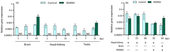 For the in vivo RGNNV infection, fish at resting reproductive stage were mock- (control) or RGNNV-infected (106 TCID50 RGNNV per fish) in a total volume of 100 μL per fish. Fish (n = 5 fish group-1 time-1) were sampled 1, 7, or 15 days post-infection (dpi) and brain (target tissue of RGNNV), head-kidney, and testis tissues were sampled [].