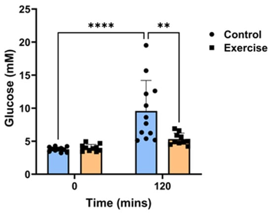 Exercise prevented circadian disruption-induced glucose intolerance. Male P. obesus (n = 12/group) were split into two groups: (1) control (no running wheel) and (2) exercise (running wheel) and exposed to a short photoperiod (5 h light:19 h dark) and fed a high energy diet for 10 weeks. Oral glucose tolerance tests were performed in week 9 at ZT2, where animals received a bolus administration of glucose (2 g/kg body weight). Blood glucose levels were measured 120 min post-glucose administration. Data presented as mean ± SD. ** p < 0.01, **** p < 0.0001 by two-way ANOVA (Šídák’s post hoc comparison).