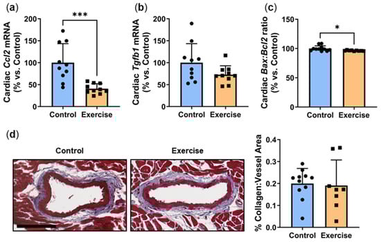 Exercise reduced inflammation and apoptosis in cardiac tissue but had no effect on myocardial perivascular fibrosis. Male P. obesus (n = 12/group) were split into two groups: (1) control (no running wheel) and (2) exercise (running wheel) and exposed to a short photoperiod (5 h light:19 h dark) and fed a high energy diet for 10 weeks. Cardiac expression of (a) Ccl2, (b) Tgfb1 and (c) Bax:Bcl2 ratio, normalised using the ΔΔCt method to Cyclophilin and controls. (d) Representative images of Masson’s trichrome-stained hearts depicting collagen (blue) deposition surrounding the vessels. Perivascular fibrosis was analysed by determining the area of blue staining around selected vessels and normalised to the vessel area. Cropped images are used in the figure, while the original, uncropped images are presented in Supplementary Figure S1. Data presented as mean ± SD. * p < 0.05, *** p < 0.001 by unpaired t-test or Mann–Whitney test.