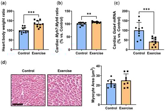 It is well-established that exercise increases heart weight and causes cardiac tissue hypertrophy. The heart:body weight ratio was significantly higher in P. obesus in the exercise group than in the control (Exercise: 133.3 ± 16.9% vs. Control: 100.0 ± 14.7%, p < 0.001, Figure 3a). Diabetes is known to be linked to cardiac hypertrophy in P. obesus [16]. Cardiac hypertrophy was assessed by measuring the ratio of hypertrophy genes Myh7: Myh6. Consistent with the increased heart:body weight ratio, there was a slight but significant increase in the Myh7:Myh6 mRNA ratio (Exercise: 106.6 ± 2.5% vs. Control: 100.0 ± 6.3%, p < 0.01, Figure 3b). Despite this, exercise induced a significant reduction in Gata4, the transcription factor that controls these hypertrophy markers (Exercise: 41.3 ± 20.1% vs. Control: 100.0 ± 40.9%, p < 0.001, Figure 3c), and there were no differences in cardiomyocyte size (Figure 3d).