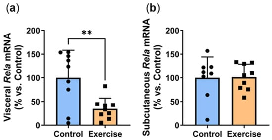 Inflammation is an underlying cause of adipose dysfunction, and hyperglycaemia contributes to a pro-inflammatory environment [17]. We recently showed that circadian disruption combined with a high-energy diet stimulates a pro-inflammatory environment in visceral adipose tissue [5]. In this study, exercise significantly decreased gene expression of Rela, the active p65 subunit of NFκB (Exercise: 34.5 ± 22.5% vs. Control: 100.0 ± 58.1%, p < 0.01, Figure 4a). However, no differences were observed in the subcutaneous adipose tissue (Figure 4b).