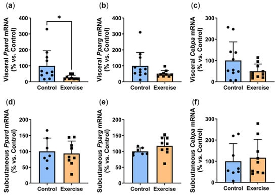 Increased adipocyte differentiation is associated with improved adipocyte function. We next explored the effect of exercise on the gene expression of Ppard, Pparg and Cebpa, critical transcription factors involved in adipogenesis [18]. Exercise significantly reduced visceral Ppard expression (Exercise: 27.2 ± 13.7% vs. Control: 100.0 ± 94.5%, p < 0.01, Figure 5a). Visceral expression of Pparg (Figure 5b) and Cebpa (Figure 5c) were approximately 50% lower in the exercise group, although these did not quite reach statistical significance (p = 0.0674 and p = 0.1058 respectively). In contrast, no differences were observed in the subcutaneous adipose tissue (Figure 5d–f).
