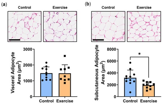 Adipocyte hypertrophy is an established indicator of the degree of metabolic impairment/disturbance in patients [21]. Increased adipocyte size is associated with key characteristic parameters that underpin T2DM, including insulin resistance and a pro-inflammatory phenotype [22]. While we observed no differences in visceral adipocyte area (Figure 7a), exercise significantly reduced subcutaneous adipocyte area (Exercise: 1931 ± 544 µm2 vs. Control: 3180 ± 1292 µm2, p < 0.05, Figure 7b).