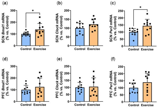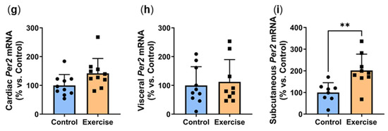 We next explored the effects of exercise on the expression of clock genes Bmal1, Clock and Per2. In the suprachiasmatic nucleus (SCN), exercise significantly increased ZT7 Bmal1 mRNA (Exercise: 137.7 ± 51.3% vs. Control: 100.0 ± 16.5%, p < 0.05, Figure 8a). SCN expression of Clock expression was approximately 20% higher in the exercise group, although this did not quite reach statistical significance (p = 0.1006, Figure 8b). Exercise significantly increased ZT7 Per2 mRNA in the suprachiasmatic nucleus (Exercise: 143.8 ± 46.7% vs. Control: 100.0 ± 25.3%, p < 0.05, Figure 8c). In the prefrontal cortex (PFC), no differences were observed in gene expression of Bmal1 (Figure 8d) and Clock (Figure 8e). We observed non-significant 40% increases in Per2 expression in both the prefrontal cortex (p = 0.0994, Figure 8f) and heart (p = 0.0532, Figure 8g). While no differences were seen in visceral Per2 expression (Figure 8h), subcutaneous Per2 was 2-fold higher in the exercise group (Exercise: 201.6 ± 75.3% vs. Control: 100.0 ± 45.2%, p < 0.01, Figure 8i).