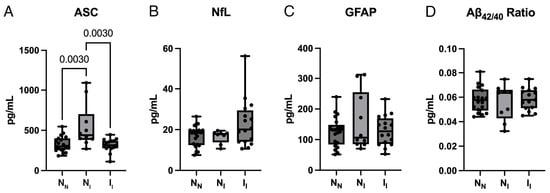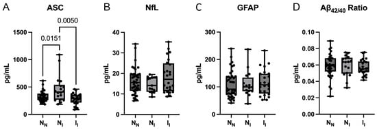 ASC plasma levels are increased in the normal–impaired (NI) group. Protein concentration levels in pg/mL of ASC (A), NfL (B), GFAP (C), and Aβ42/40 (D) in the plasma of NN, NI, and II participants. N = ASC: NN: 39, NI: 18, II: 24; NfL: NN: 40, NI: 15, II: 24; GFAP: NN: 40, NI: 16, II: 24; Aβ42/40: NN: 35, NI: 17, II: 24. Data presented as box plots with the minimum and maximum values showing all points. NN: normal–normal cognition; NI: normal–impaired cognition; II: impaired–impaired cognition.
