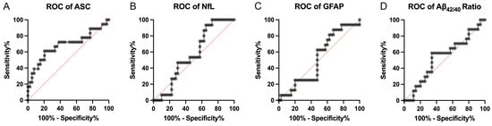 Data obtained from the Simple and Multi-Plex assays were analyzed using Prism 10 software (v. 10.0.3) (GraphPad, San Diego, CA, USA). Outliers were removed before analysis via the ROUT method (Q = 1%) for each group and for each analysis. Receiver operating characteristics (ROCs) were calculated for ASC, NfL, GFAP, and Aβ42/40 ratio. The area under the curve (AUC) was determined as well as a cut-off point from a range of specificities and sensitivities, together with their negative predictive value (NPV), positive predictive value (PPV), respective likelihood ratio, and accuracy.