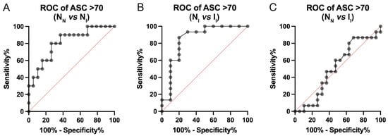 ASC has a higher AUC in older participants. ROC curves for ASC from the plasma of NN vs. NI (A), NI vs. II (B), and NN vs. II (C) participants. N = NN: 19, NI: 10, II: 15. NN: normal–normal cognition; NI: normal–impaired cognition; II: impaired–impaired cognition.