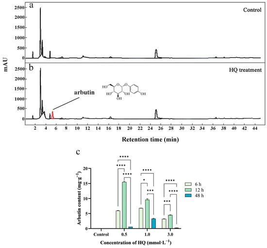 The effect of HQ on the biosynthesis of main compounds in V. dunalianum suspension cells. (a) HPLC chromatograph of the extracts suspension cells in the control group. (b) HPLC chromatograph of the extracts suspension cells in HQ treatment group. (c) Arbutin content in suspension cells treated with different concentrations of HQ at different times. The data was the means of three replicates (n = 3), and the vertical bars represented the standard error of replicates. Asterisk symbols (*) indicated significant differences according to Duncan’s multiple range test (* p < 0.05; *** p < 0.001; **** p < 0.0001).