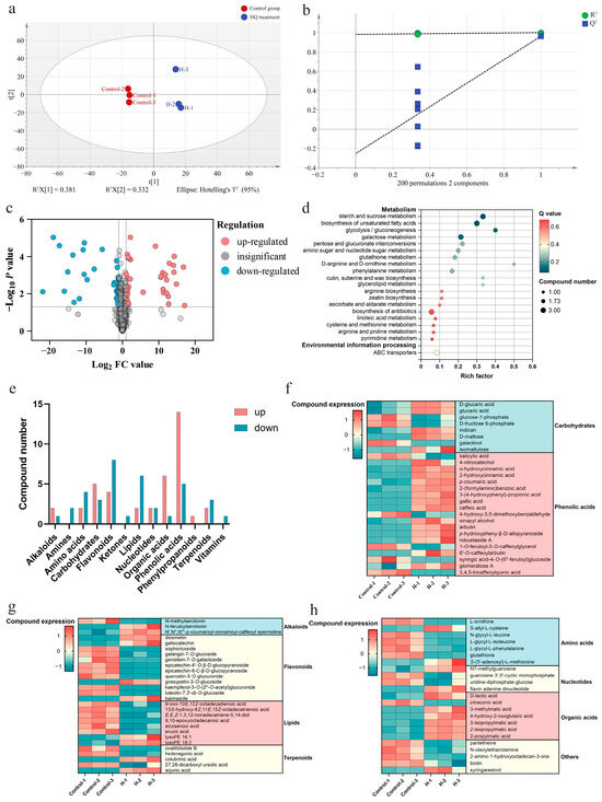 Analysis of DEMs in V. dunalianum suspension cells treated with 0 and 0.5 mmol·L−1 HQ for 12 h. (a) PLS-DA model with the model parameter values of R2X (cum) = 0.713, R2Y (cum) = 0.999, Q2 (cum) = 0.962. (b) Permutation test with 200 iterations and the intercepts of R2 = 0.981, Q2 = −0.252. (c) Volcano plot of differential metabolites. (d) KEGG enrichment analysis of differential metabolites with top 20 pathways. (e) Classification of differential metabolites. (f–h) Expression of differential metabolites.