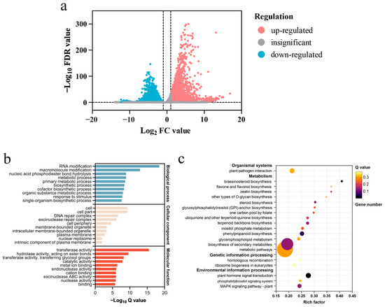 Transcriptome sequencing results showed that there were 10,628 DEGs in suspension cells treated with 0 and 0.5 mmol·L−1 HQ for 12 h, including 4125 up-regulated and 6503 down-regulated genes in HQ-treated suspension cells compared with the control group (Figure 3a and Table S3). GO analysis revealed that RNA modification, cell, and transferase activity were the most enrichment terms in biological process, cellular component, and molecular function ontologies respectively (Figure 3b). Furthermore, KEGG analysis demonstrated that DEGs were predominantly enriched in pathways related to plant hormone signal transduction (ko04075), brassinosteroid biosynthesis (ko00905), and phenylpropanoid biosynthesis (ko00940) (Figure 3c).