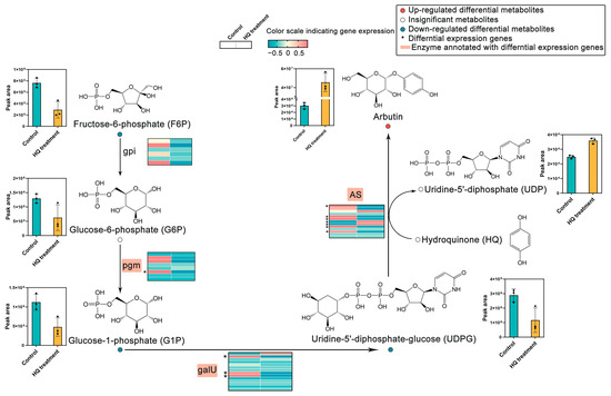 Metabolites associated with DEGs in the arbutin synthetic pathways also underwent changes. In the synthetic pathway, F6P, glucose-1-phosphate (G1P), and UDGP were identified as down-regulated DEMs in HQ-treated suspension cells, while glucose 6-phosphate (G6P) also decreased although it was not a DEM (Figure 4 and Table 2). All these metabolites are precursors of arbutin synthesis. Arbutin was identified as an up-regulated DEM. There was a significantly higher amount of arbutin and an increased peak area of UDP in suspension cells treated with HQ compared with control (Figure 4 and Table 2). These findings were consistent with the results of the transcriptomics analysis.