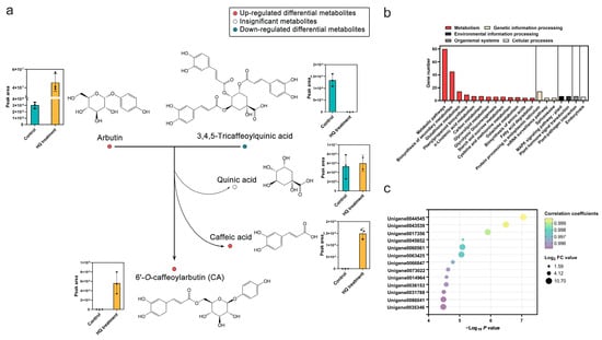 Previously, cell suspension cultures of V. dunalianum were established with the aim of mass-producing arbutin and CA [20]. However, a low content of CA (0.44%) was detected in V. dunalianum suspension cells, whereas no arbutin was detected through liquid chromatography–mass spectrometry (LC-MS) analysis [21]. Recent studies have approved hydroquinone (HQ) as a precursor for arbutin synthesis in plant cell cultures [22]. Meanwhile, CA is a is a caffeoyl conjugate at the glucose-6′ position of arbutin, but the specific caffeoyl-transferase involved in its synthesis remains unknown [23]. Although the synthetic pathway of CA has not been clarified, it is speculated that enhancing arbutin synthesis may positively influence CA biosynthesis. Additionally, precursor feeding can promote the accumulation of plant secondary metabolites, resulting in changes in both metabolites and genes. Transcriptomics and metabolomics are powerful high-throughput technologies and invaluable in elucidating the synthesis pathways of important secondary metabolites in plants by identifying differentially expressed genes and metabolites [24,25,26]. In recent years, the combined analysis of transcriptomics and metabolomics has been widely used in studying the metabolic pathway of plant bioactive compounds [27,28].