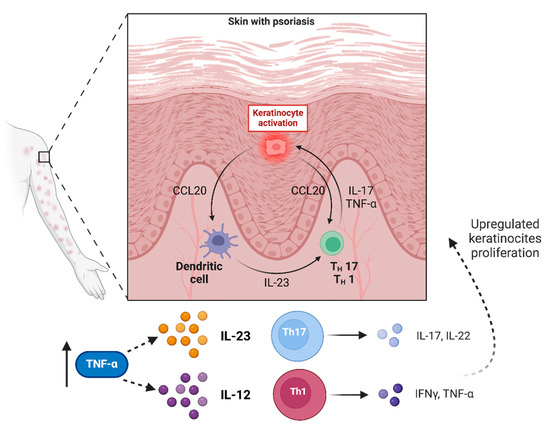 - Harper, E.G.; Guo, C.; Rizzo, H.; Lillis, J.V.; Kurtz, S.E.; Skorcheva, I.; Purdy, D.; Fitch, E.; Iordanov, M.; Blauvelt, A. Th17 Cytokines Stimulate CCL20 Expression in Keratinocytes In Vitro and In Vivo: Implications for Psoriasis Pathogenesis. J. Investig. Dermatol. 2009, 129, 2175–2183. [Google Scholar] [CrossRef]