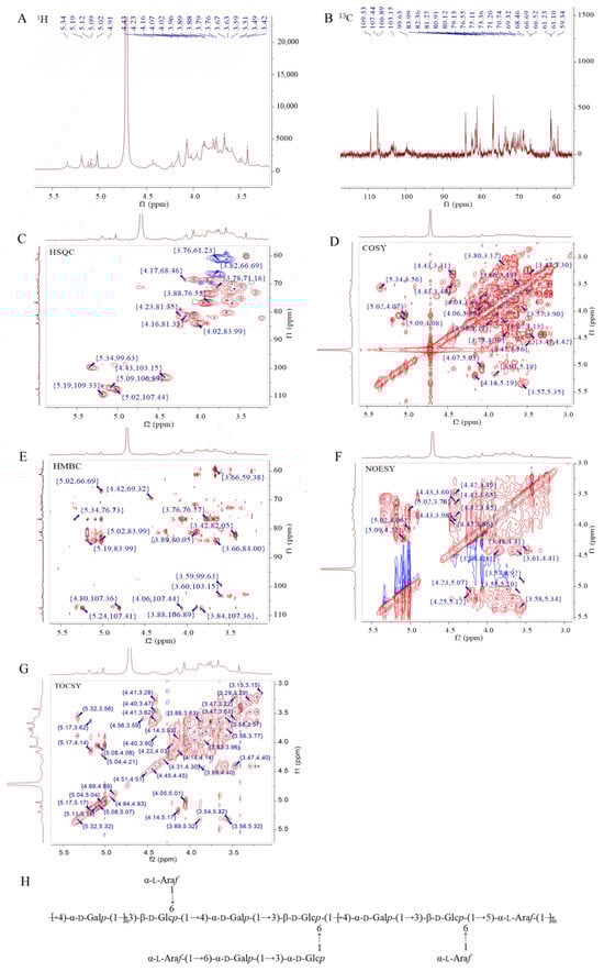 | F →6)-α-D-Galp-(1→ | 5.19/106.41 | 3.91/72.95 | 3.65/75.81 | 3.79/71.17 | 3.9/73.75 | 3.83, 3.69/66.52 | |