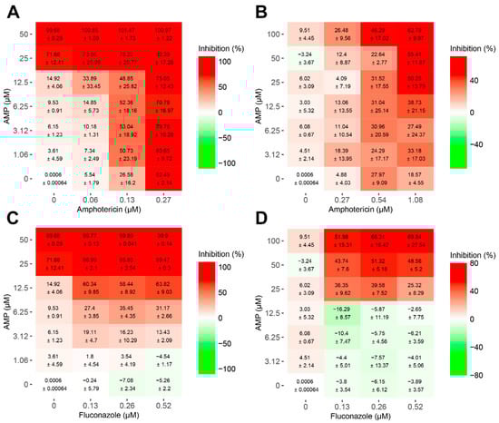 Biofilm inhibition dose–response matrix after treatment with ToAP2 and conventional antifungals. (A,B) Inhibition of early-phase (4 h) and mature (24 h) C. albicans biofilms after 24 h treatment with ToAP2 and/or Amphotericin B, respectively. (C,D) Inhibition of early-phase (4 h) and mature (24 h) C. albicans biofilms after 24 h treatment with ToAP2 and/or fluconazole, respectively. Cell viability was measured by fluorescence with Alamar blue reagent after 2 h of incubation. The viability data were transformed to inhibition using the SynergyFinder Plus R package 3.10.3. The axes represent the concentrations for ToAP2 (rows) and each antifungal (columns). The heatmap scales vary from red, indicating no growth, to green, indicating maximum growth. Data are presented as mean ± standard error of the mean of three independent assays.