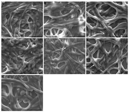 SEM images of C. albicans mature biofilms after different treatments. (A) Treatment with 100 µM ToAP2, (B) 100 µM NDBP-5.7, (C) 52 µM Fluconazole, (D) 1.08 µM Amphotericin B, (E) combination of ToAP2 and Amphotericin, (F) combination of ToAP2 and fluconazole, (G) untreated control. Scale bar: 10 µm. White arrows highlight morphological changes in biofilms after treatment in comparison to the control.