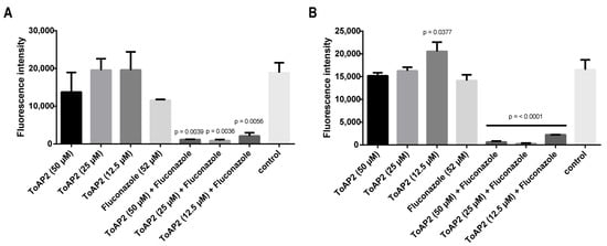 These results demonstrate the great potential of the combination of Fluconazole and ToAP2 in eliminating biofilms on surfaces such as intravenous catheters, which are closely associated with systemic candidiasis. Cools et al. [51] found similar results with the combination of caspofungin and the peptide HsLin06_18, which significantly reduced C. albicans biofilms in intravenous catheters. Additionally, Raman et al. [52] showed that catheters loaded with different polymers containing a β peptide were able to inhibit the growth of C. albicans biofilms.