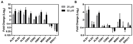 Although the accumulation of transcripts for most of the evaluated genes was not affected by the ToAP2 treatment in the C. albicans biofilms (Figure 5B), an upregulating effect was observed in the ALS1 and ALS5 genes at both concentrations of ToAP2 tested (25 µM and 50 µM).