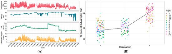 The environmental conditions during the pond-rearing period (n = 2484 observations) revealed a max temperature of 35.03 and a min of 25.81 °C; the average temperature was 29.67 °C; the salinity ranged from 21.58 to 41.61 ppt, with an average of 37.25 ppt; the pH ranged from 7.76 to 9.99 units; and the dissolved oxygen ranged from 0.01 to 14.90 mg/L, with an average of 2.86 mg/L (Figure 1A). Fish grew in the net pens from 40 mm to 150 mm (Figure 1B).