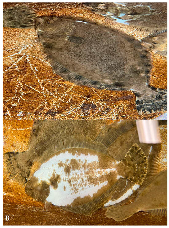 Normal pigmentation is crucial for flatfishes to survive in the natural environment. Pseudo-albinism is a complex, permanent condition presented in cultured pleuronectiforms [21,22], with individuals displaying irregular pigmentation (Chao et al., 2021) [40]. Pseudo-albinism increases the susceptibility to environmental stress due to the inability to camouflage and the lack of protection against UV light. Detrimental effects on the immune system of pseudo-albino individuals showed that stressed individuals are at higher risk for diseases [41] Other studies reported compromised survival abilities of mal-pigmented fish [32,33]. Regarding stock enhancement, mal-pigmented fishes negatively impact the public’s perception of these fishery management efforts [11,29,35]. Using fish with pseudo-albino-pigmentation for release into the natural environment generates questions related to the fitness, survival, susceptibility to predators, diseases, and albinism heritability if mating between “wild” normal and pseudo-albino-pigmented individuals occurs [13,27,35].