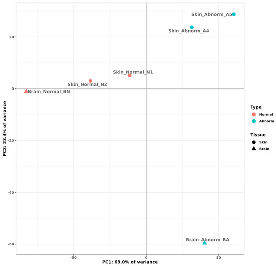 A multi-dimensional scale plot (prepared with normalized counts) revealed that the first principal component (PC) of normal versus pseudo-albino skin accounted for 69% of the variance, and the second PC comparing the skin and brain tissues accounted for 23% of the variance (Figure 3). Biological replicates clustered closely together, indicating only a slight variation between replicates. Skin and brain samples from normally pigmented flounder appeared at the border between quadrant 2 (skin samples) and 3 (brain sample), indicating slight differences in the tissue-specific transcriptome in normally pigmented individuals. Skin replicates from pseudo-albino individuals formed a separate group in quadrant 1. The brain transcriptome from the pseudo-albinos was different from all the samples and isolated in quadrant 4 (Figure 3). A total of 1044 genes out of 2324 upregulated genes were above the cutoff value of (FDR < 0.01) in skin samples from pseudo-albino fish. The analysis of the brain samples from normally pigmented and pseudo-albino flounder revealed 238/571 genes and 269/845 downregulated genes in the pseudo-albino flounder (Figure 4).