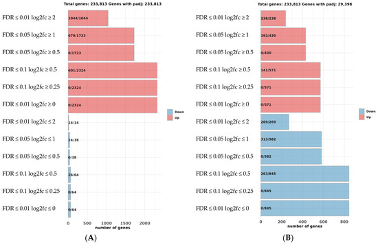 False discovery rate (FDR) of the data contrasting the pseudo-albino-pigmented (abnormal) vs. normally pigmented Southern flounder, skin sample (A), and brain (B). Upregulated genes are displayed in red and downregulated genes in blue.