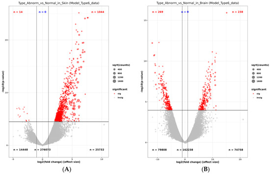 Volcano plots comparing the statistical significance based on −log 10 of the p-value against the log2-fold change between the normal and pseudo-albino (abnormal) Southern flounder skin (A) and brain (B). Significantly deregulated genes are marked in red with downregulated genes on the left and upregulated genes on the right side of the plot.