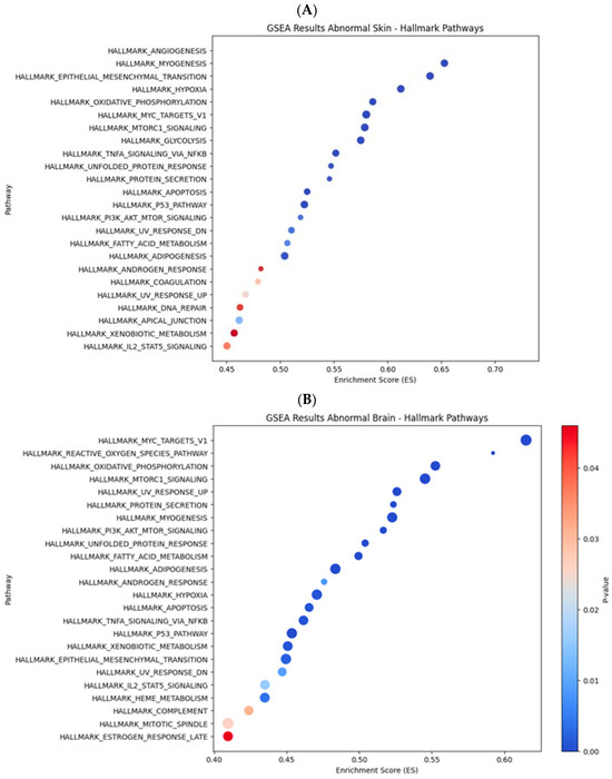 A comparison of the differential gene expression of the two phenotypes using GSEA revealed hallmark pathways with gene topologies related to biological functions associated with the Southern flounder pseudo-albino phenotype in skin and brain tissues (Figure 6). The hallmark pathways related to critical biological processes were clustered into the following: (a) tissue formation, regeneration, and healing; (b) cancer and aging; (c) metabolism; and (d) endocrine response. These clusters were present in both tissues, but the enrichment scores and statistical significance of the enrichment were dissimilar in the skin and brain (Figure 6).