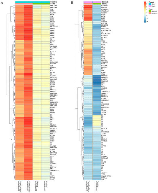 A heat map displaying differential gene expression with a cutoff value of p < 0.05 and log2fold change > |1| for the skin (A) and brain (B) of normally (green) and pseudo-albino (pink)-pigmented Southern flounder. Red and orange colors indicate highly expressed genes, while the dark blue color is indicative of low-expressed genes.