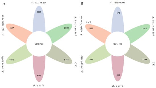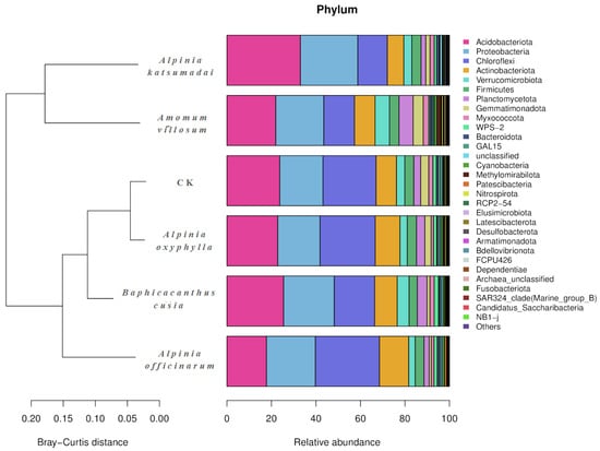2.2. Microbial Diversity in the Rhizosphere Soils of A. katsumadai, A. villosum, A. officinarum, A. oxyphylla, B. cusia, and the Pure Rubber Forest