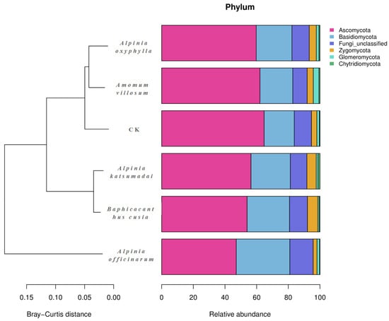 | Fungal Phylum | p Value | Relative Abundance Comparison between Rhizosphere Soil Sample Groups |