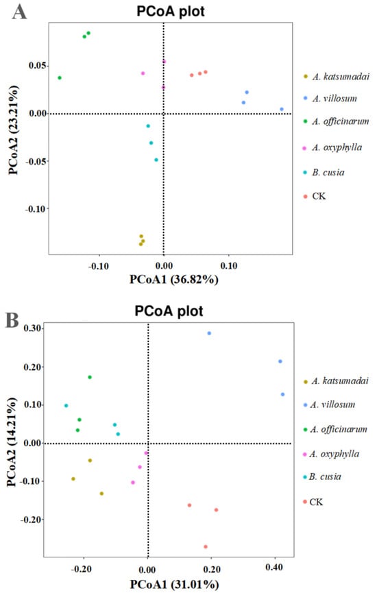2.2.2. Beta Diversity Indices of the Bacterial and Fungal Communities in the Rhizosphere Soils of A. katsumadai, A. villosum, A. officinarum, A. oxyphylla, B. cusia, and the Pure Rubber Forest