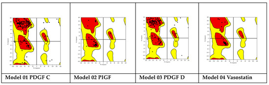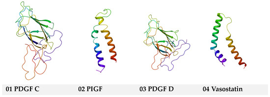 As presented in the Section 4, a complete series of 3D protein molecule structures (PDB) that act on VEGF2 and consecutively inhibit or stimulate vascular morphogenesis have been used. Homology modeling was used for some structures to generate 3D molecules using their Uniprot ID (where the PDB structure was unavailable). As stated, homology modeling for the angiogenesis inhibitor Vasstatin and angiogenesis stimulators PDGFC, PIGF, and PDGF D was performed using their Uniprot IDs. The resulting structures are shown below (Figure 1):