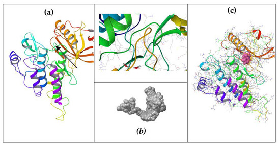Furthermore, the chimeric homology model computed for the inhibitory protein structures using their Aa sequences has a sequence similarity of 99.99%, a molecular probability score of 2.03, a general clash score of 3.99, a Ramachandran plot favored score of 93.76%, a rotamer outlier of 3.75%, an aC beta deviation of 2, a ratio of bad bounds to favorable bounds of 2/3449, and a ratio of bad angles to favorable angles of 20/4662 (results obtained using mol Probability version 4.1, as stated in the Section 4). As stated in the Section 4, the chimeric model was further optimized using the Swiss online preparation server. The structure is represented in Figure 7a.