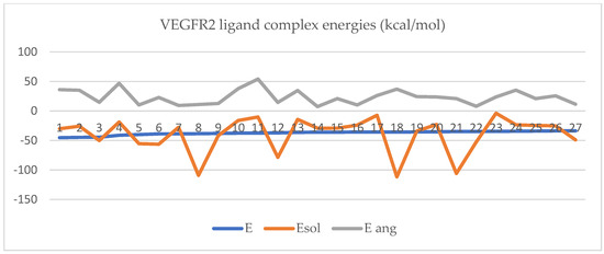 Docking energies of VEGFR2 against a set of Chembl1 structures. For ligands 1–27, see Supplementary File S1 and Section 4. E_total energy (kcal/mol); E sol—solvation energy (Kcal/mol); E ang—angulation energy (kcal/mol) (ligand names and structures can be found in Supplementary File S4).