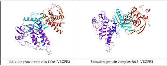 Several residues on VEGFR2 have been identified as involved in protein–protein interactions (PPIs), particularly with its ligands (Vascular Endothelial Growth Factors, VEGFs) and other signaling molecules. While the specific residues involved may vary depending on the interaction partner and context, here are some general insights into the regions and residues of VEGFR2 involved in PPIs. The extracellular domain of VEGFR2 interacts with VEGF ligands, typically homodimers or heterodimers. Specific residues within the extracellular domain of VEGFR2 bind to VEGF. For example, residues in the ligand-binding domain (LBD), including those in Ig-like domains, have been implicated in VEGF binding. The intracellular tyrosine kinase domain of VEGFR2 is involved in downstream signaling cascades following ligand binding. This domain can interact with various signaling proteins through phosphorylation-dependent or -independent interactions, including adaptor molecules and other kinases. Specific residues within the TKD may participate in these interactions, particularly those in substrate recognition and catalysis. VEGFR2 undergoes autophosphorylation on specific tyrosine residues within its intracellular domain upon ligand binding. These phosphorylated tyrosine residues serve as docking sites for downstream signaling proteins containing SH2 (Src homology 2) or PTB (phosphotyrosine-binding) domains, mediating protein–protein interactions critical for signal transduction. Through direct or indirect interactions, VEGFR2 can form complexes with other receptors or co-receptors, such as neuropilins, integrins, and other RTKs. Adaptor proteins or scaffolding molecules often mediate these interactions, and specific residues within VEGFR2 may contribute to the stability or specificity of these complexes. VEGFR2 contains regulatory domains, such as the juxtamembrane and kinase insert domains, which may participate in protein–protein interactions that modulate the receptor’s activity, localization, or stability. In this study, 12 protein–protein docking studies were performed on inhibitory protein complexes and 14 on stimulant protein complexes. All the protein docking studies retrieved stable VEFFR2–protein complexes.