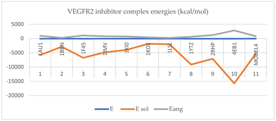 VEGFR2 inhibitor complex energies (kcal/mol): E−the total complex energy; E sol—solvation energy; E ang—angular energy.