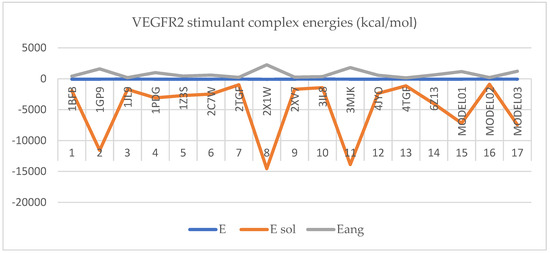 In Figure 5 and Figure 6, the protein–protein docking results are displayed. In Figure 5, VEGFR2 docked with the inhibitory proteins is shown. The best docking energies (kcal/mol) are observed when VEGFR2 is docked with 1AU1, and the most considerable complex energy is observed at the VEGFR2-1BBN complex. However, all complexes display favorable energies with presumably notable biological activity. In Figure 6, VEGFR2 is docked with the stimulant proteins. The protein 2X1W forms the most favorable complex with VEGFR2. In this case, 2TGP forms the lowest-energy complex (kcal/mol). Like in the case of inhibitory proteins, all complexes are energetically favorable. If a complex has a negative total energy, it generally indicates that the interactions within the complex are favorable and that the complex is stable. Negative total energy suggests that the attractive forces (such as electrostatic interactions, hydrogen bonding, and van der Waals interactions) between the molecules in the complex outweigh the repulsive forces (such as steric hindrance or electrostatic repulsion). These favorable interactions contribute to the stability of the complex. A negative total energy often correlates with a strong binding affinity between the molecules in the complex. The stronger the binding affinity, the more negative the total energy tends to be. This indicates that the complex will likely form and persist under given conditions. In thermodynamic terms, a negative total energy corresponds to a decrease in the overall free energy of the system upon complex formation. This suggests that the complex is stable under the prevailing conditions and that the formation of the complex is thermodynamically favorable. It is important to note that the accuracy of energy calculations depends on the methods used for computation (e.g., quantum mechanical calculations, molecular mechanics simulations). Different computational methods may yield different absolute energy values, but the relative energy values (such as the change in energy upon complex formation) are generally more meaningful. While a negative total energy indicates stability, it does not necessarily guarantee biological activity or function. Experimental validation is often required to confirm the biological relevance of a predicted complex. Additionally, factors such as entropy and solvent effects, which are not always fully accounted for in energy calculations, can influence the stability of complexes in biological systems. Solvation energy refers to the energy change associated with the process of solvation, where solvent molecules surround and interact with solute molecules to form a solution. It plays a crucial role in various chemical and biochemical processes, influencing the stability, solubility, and reactivity of solutes in solution. Solvation energy can be either favorable (exothermic) or unfavorable (endothermic) depending on the nature of the solute–solvent interactions. Solvation energy is the difference in energy between the solvated and separated states of solute and solvent molecules. It represents the overall effect of solvent molecules stabilizing or destabilizing the solute. When solvent molecules interact favorably with the solute, solvation energy is negative (exothermic), indicating that the solvated state is more stable than the separated state. This typically occurs when solute–solvent interactions are strong, such as in the case of polar solutes dissolving in polar solvents or nonpolar solutes dissolving in nonpolar solvents. Conversely, when solvent–solute interactions are weak or repulsive, solvation energy is positive (endothermic), indicating that the solvated state is less stable than the separated state. This may occur when dissolving nonpolar solutes in polar solvents or polar solutes in nonpolar solvents, where the interactions between unlike molecules are less favorable. The magnitude of solvation energy depends on various factors, including the nature of solute and solvent molecules, their polarity, size, shape, and temperature and pressure conditions. Solvation energy influences the rates and equilibrium of chemical reactions occurring in solution. Solvation of reactant molecules can either enhance or hinder their reactivity by stabilizing or destabilizing their transition states and intermediate species. In summary, angle energy is the potential energy associated with deviations of bond angles from their equilibrium values within a molecule. It is an important component of the total potential energy in molecular mechanics simulations and is crucial in determining molecules’ conformational stability and behavior. The specific form of the angle energy term varies depending on the force field being used. However, in general, it represents the energy associated with the bending or stretching of bonds and contributes to the overall potential energy of the molecular system. In a molecular system, chemical bonds connect atoms, and these bonds have characteristic bond angles. The angle energy arises from the deviation of these bond angles from their preferred or equilibrium values. When the bond angles deviate, the system’s potential energy increases, contributing to the overall energy of the molecule. Here, both angular and solubility energies show favorable values that correlate with the total complex energies. Overall, docking results show that the docking procedure was performed properly. Finally, VEGFR2 forms stable active complexes with the inhibitory and stimulant peptides retrieved from the literature [57,58,59]. However, all complexes of the inhibitory and stimulatory proteins display favorable energies with presumably notable biological activity. Regarding inhibitory molecule docking energies, the most favorable energy is observed at 4EB1 with a total complex energy of −92.87 kcal/mol. The highest docking energy at a stimulant molecule is observed for 2X1W with a docking energy of −99.99 kcal/mol.