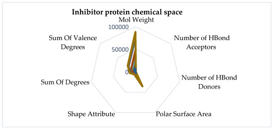 Angiogenesis chemical space of inhibitory and stimulating proteins in chimeric models characterized by molecular weight, number of hydrogen bond donors, number of hydrogen bond acceptors, shape attribute of each molecule, polar surface, and the sum of degrees.