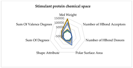 Chemical space of inhibitory and stimulant proteins of angiogenesis. The chemical space is characterized by the six molecular descriptors: mol weight, number of H bond acceptors, number of H bond donors, polar surface area, shape attribute, sum of degrees, and sum of valence degrees. The chemical space is represented as radar plots.
