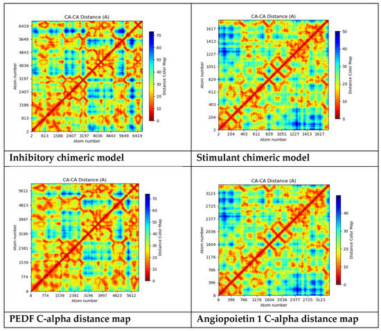 Furthermore, the C-alpha-based distance plot computed for the chimeric inhibitory and stimulant models and plots for PEDF and Angiopoietin 1 are represented in Figure 11.