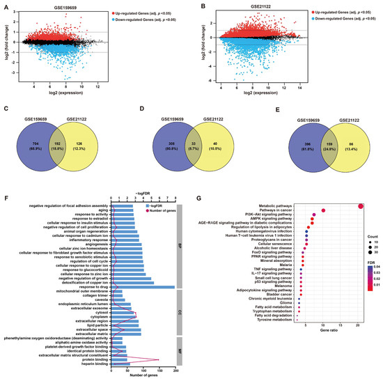 DEG screening and enrichment analysis. (A,B) Mean difference (MD) plots generated from GEO2R analysis show the relationship between log2 fold changes and average log2 expression values to visualize DEGs of GSE159659 and GSE21122 datasets. As shown, genes with an adjusted p-value cutoff of 0.05 were highlighted for their differential expression (red, up-regulated; blue, down-regulated). (C–E) Venn plots illustrate 192 overlapped DEGs (common DEGs), including 33 co-upregulated DEGs and 159 co-downregulated DEGs. (F) GO enrichment analysis of these common DEGs in BP, CC and MF. (G) KEGG pathway analysis of these common DEGs.