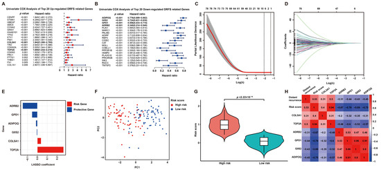 To screen DRFS-related DEGs, Cox regression analysis was performed using expression profiling and survival data of 140 patients from the GSE30929 dataset. According to the univariate Cox regression analysis, 126 DEGs were found to be highly related to DRFS (Figure 3A,B). Furthermore, Lasso Cox regression was applied to construct a prognostic risk model based on these 126 DRFS-related DEGs, which consisted of six genes, including Collagen type V alpha 1 chain (COL5A1), DNA topoisomerase II alpha (TOP2A), glycerol-3-phosphate dehydrogenase 1 (GPD1), adrenoceptor beta 2 (ADRB2), G0/G1 switch 2 (G0S2) and adiponectin (ADIPOQ). The optimal value of λ and the coefficients of these six genes were illustrated, respectively (Figure 3C,D). The up-regulated genes, COL5A1 and TOP2A, with HR > 1, were regarded as LPS prognostic risk factors, while the down-regulated genes, including GPD1, ADRB2, G0S2 and ADIPOQ, with HR < 1, were considered as protective genes (Figure 3A,B,E).