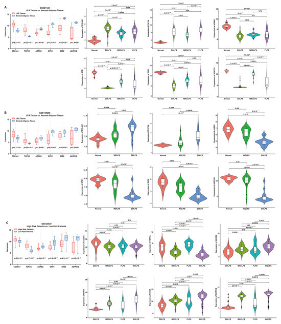 Expression features of six signature genes involved in the risk model. (A,B) Comparison of gene expression between LPS and normal adipose tissue (box plot) and elucidation of expression features (violin plots) of each gene from patients in GSE21122 and GSE159659 datasets, respectively. (C) Comparison of gene expression between low- and high-risk patients (box plot) and expression features (violin plots) of each gene from patients in the GSE30929 dataset.